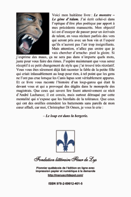 Voici mon huitième livre : Le monstre – Le gène d’Adam. J’ai écrit celui-ci dans l’optique d’être plus poétique par apport à mes précédents manuscrits. Mon objectif ici est d’essayer de passer pour un écrivain de talent, en vous récitant parfois des vers qui seront pris avec un bon vin et l’espoir qu’ils n’auront pas l’air trop insignifiants. Mais attention, n’allez pas croire que je vais chercher d’arrache- pied la gloire. Si j’exprime des maux, ça ne sera pas dans n’importe quels mots, juste pour vous faire des rimes. J’espère maintenant que vous serez réceptif à ce petit changement de style que j’ai trouvé très récréatif. Vous vous êtes sûrement déjà fait raconter la fable de la petite fille qui criait inlassablement au loup pour rien, à tel point que les gens ne l’ont pas crue lorsque les Canis lupus sont véritablement apparus. Et ce livre vous raconte l’histoire d’un loup-garou qui était là devant vous et qui a provoqué des dégâts dans le monopole des magistrats. Que ceux qui savent lire lisent attentivement ce récit d’André Lachance; il est concis, mais surtout détraqué par cette mentalité qui n’expose que les bienfaits de la tolérance. Que ceux qui ont des oreilles entendent les battements sans pareils de mon cœur affadi, car moi, Christopher Di Omen, je vous le crie :