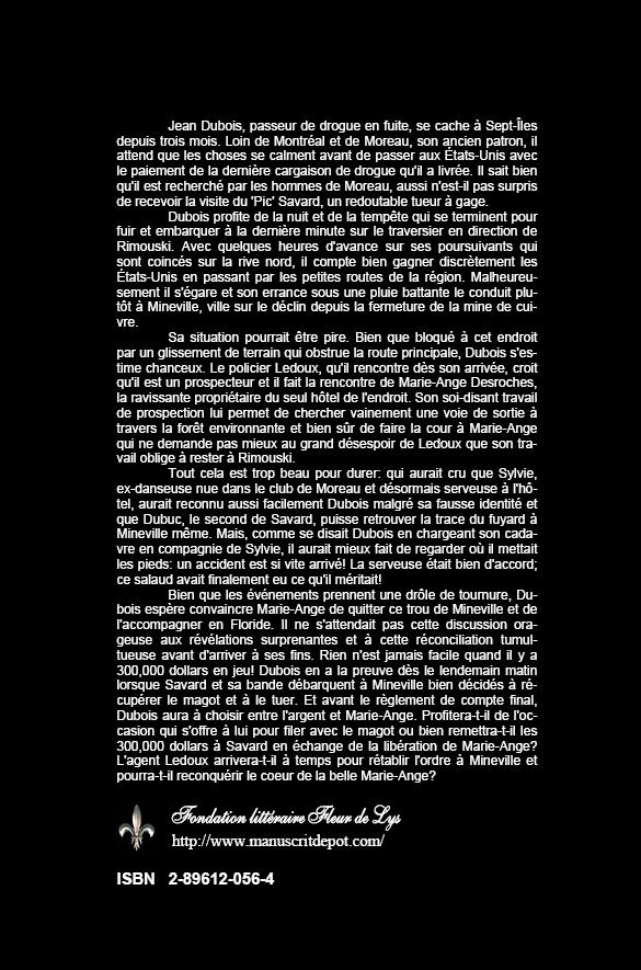 Tout cela est trop beau pour durer: qui aurait cru que Sylvie, ex-danseuse nue dans le club de Moreau et désormais serveuse à l'hôtel, aurait reconnu aussi facilement Dubois malgré sa fausse identité et que Dubuc, le second de Savard, puisse retrouver la trace du fuyard à Mineville même. Mais, comme se di­sait Dubois en chargeant son cadavre en compagnie de Sylvie, il aurait mieux fait de regarder où il mettait les pieds : un accident est si vite arrivé! La serveuse était bien d'accord; ce salaud avait finalement eu ce qu'il méritait!